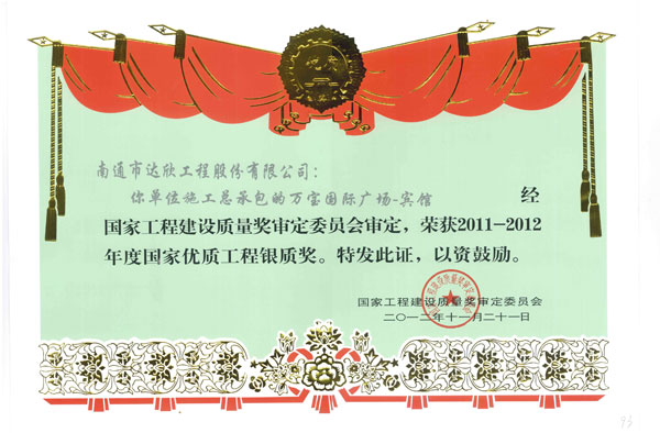 我公司總承包施工的上海“萬寶國際廣場-賓館”作為主申報單位,在先后獲得上海市“節(jié)約型”樣板工地、上海市優(yōu)質(zhì)結(jié)構(gòu)工程、上海市“白玉蘭”優(yōu)質(zhì)工程后,經(jīng)上海市建筑施工行業(yè)協(xié)會推薦,經(jīng)國優(yōu)專家組現(xiàn)場檢查,評審委員會評審,最終榮獲了2011-2012年度國家優(yōu)質(zhì)工程銀質(zhì)獎。上海萬寶國際廣場-賓館項(xiàng)目是自公司易名以來,首次以“達(dá)欣股份”為主體的總承包申報項(xiàng)目。
