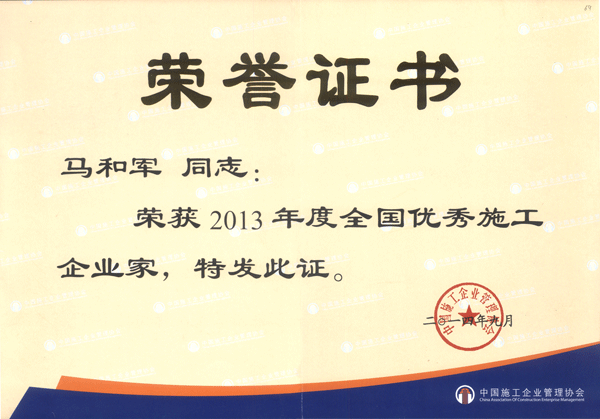 中國施工企業(yè)管理協(xié)會(huì)于今年2月發(fā)出召開“2014年全國施工企業(yè)領(lǐng)軍人物峰會(huì)”的通知,根據(jù)通知要求,嚴(yán)格按照“全國優(yōu)秀施工企業(yè)家”條件在全國范圍內(nèi)優(yōu)選參會(huì)代表。經(jīng)申請、推薦、審核、公示,中國施工企業(yè)管理協(xié)會(huì)企業(yè)家工作委員會(huì)審定,確定166位企業(yè)領(lǐng)導(dǎo)為“2014年全國施工企業(yè)領(lǐng)軍人物峰會(huì)”參會(huì)人選并授予“全國優(yōu)秀施工企業(yè)家”榮譽(yù)稱號。公司董事長馬和軍榮列榜單之中。