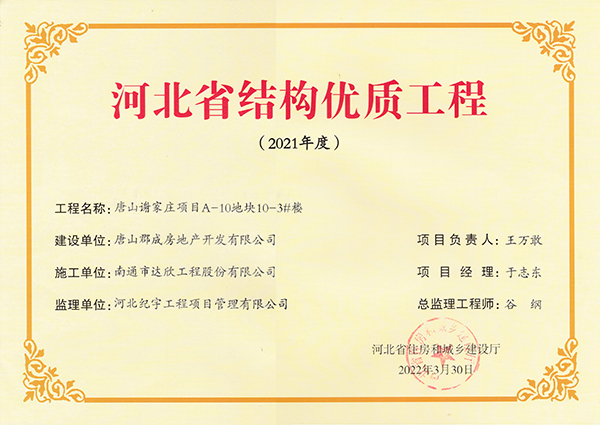 近日,從河北省住房和城鄉(xiāng)建設(shè)廳傳來(lái)喜訊,集團(tuán)邊各寨棚戶區(qū)改造項(xiàng)目、唐山謝家莊項(xiàng)目、邯鄲市雞澤縣多館合一等五項(xiàng)目榮獲河北省結(jié)構(gòu)優(yōu)質(zhì)工程。