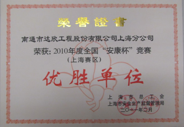 會(huì)上還對(duì)“安康杯”競(jìng)賽活動(dòng)的先進(jìn)集體與個(gè)人進(jìn)行了表彰。第一工程公司“安康杯”競(jìng)賽活動(dòng)工作的有效開展,得到了上海市總工會(huì)、上海市安全生產(chǎn)監(jiān)督管理局、上海市建交委、江蘇省駐滬辦的充分肯定,為此被評(píng)為2010年全國(guó)“安康杯”競(jìng)賽(上海賽區(qū))優(yōu)勝單位(受此表彰的外省市進(jìn)滬施工企業(yè)僅此三家),這也是第一工程公司連續(xù)三年獲此榮譽(yù)。