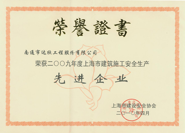 上海分公司作為江蘇省建管局駐滬辦推薦的四家企業(yè)之一,日前被上海市建設(shè)安全協(xié)會(huì)評(píng)為2009年上海市建筑施工安全生產(chǎn)先進(jìn)企業(yè)。