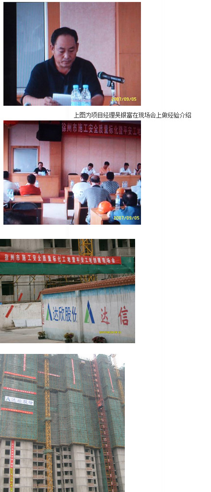 在秋高氣爽、陽光燦爛的二〇〇七年八月底,南通市達欣工程股份有限公司徐州分公司迎來雙喜,一喜“徐州建設局組織的安全質量標準化工地、平安工地現場會”在穎都2#號樓工地隆重舉行,二喜“穎都花園2#號樓二十四層”主體結構順利封頂。
