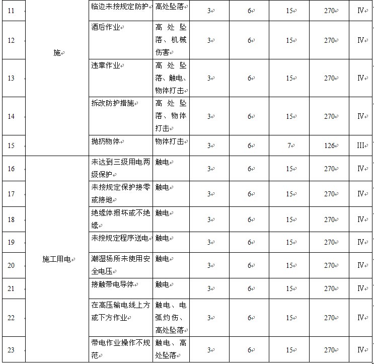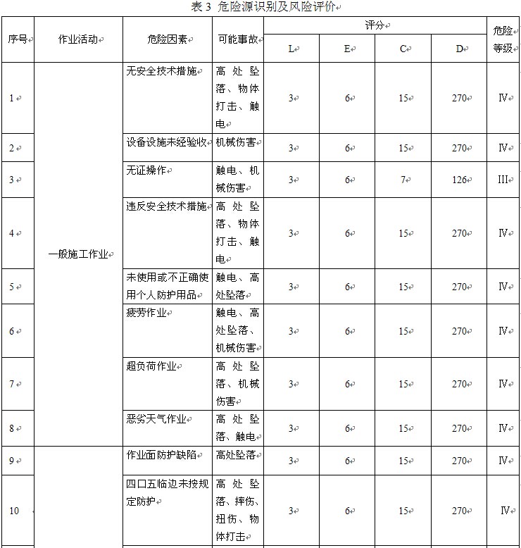 本公司目前在建的主要工程有:重慶直升機投資有限公司項目(包括總裝廠房、交付中心和教學大樓),重慶機床集團搬遷項目(包括廠房、科技大樓、倒班宿舍)。公司針對兩個施工現(xiàn)場特點進行分析,制訂了危險源識別及風險評價表,部分內容如表3。