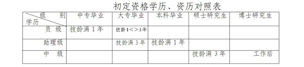 1、初定條件:大中專畢業(yè)生在所學專業(yè)與所從事工作的專業(yè)相同或相近的前提下,具備以下國家規(guī)定的相應學歷、從事專業(yè)技術工作年限(表中簡稱“技齡”)的,可申請初定相應級別的專業(yè)技術資格: